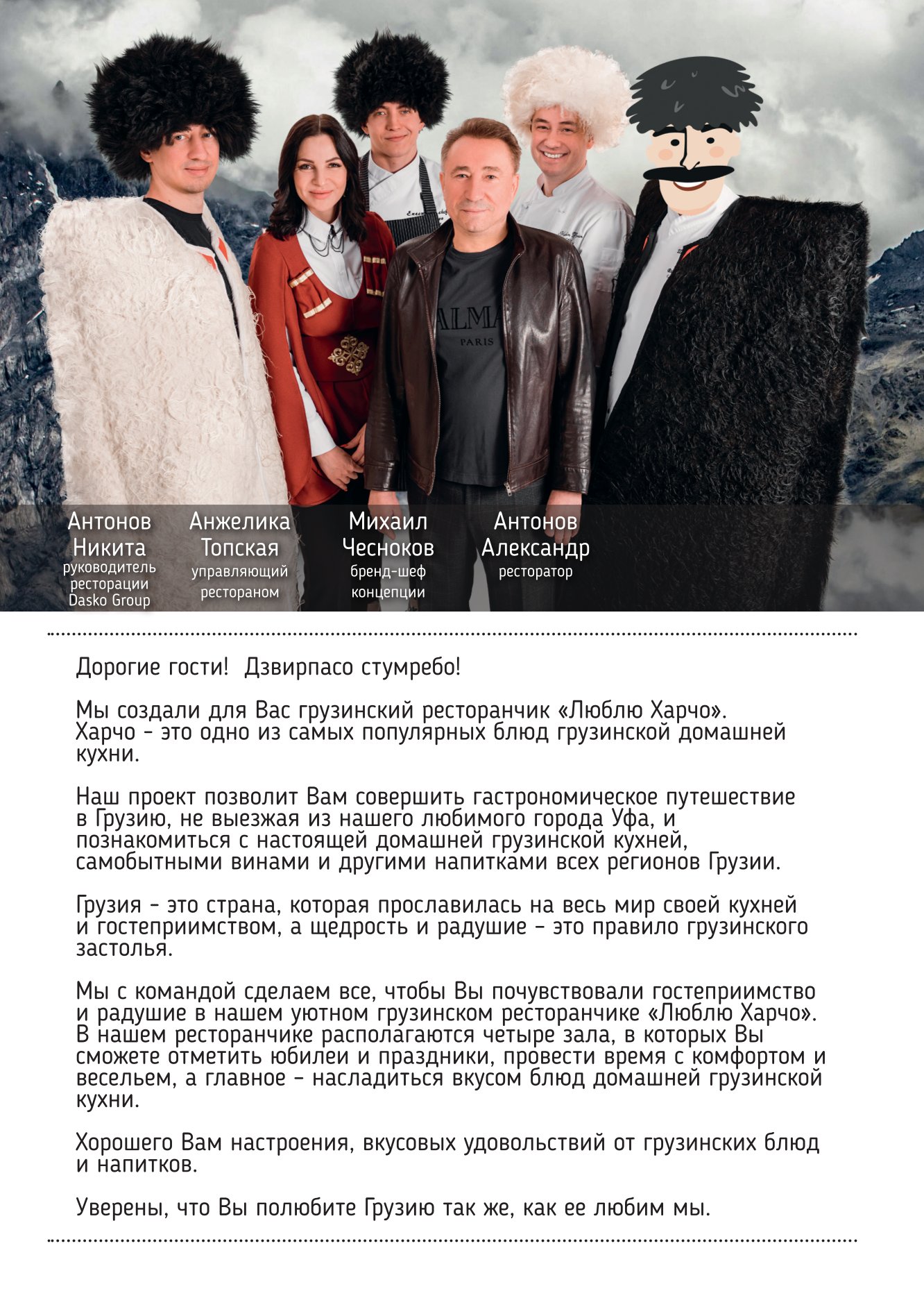 .Наш проект позволит Вам совершить гастрономическое путешествие в Грузию, не выезжая из нашего любимого города Уфа, и познакомиться с настоящей домашней грузинской кухней, самобытными винами и другими напитками всех регионов Грузии.