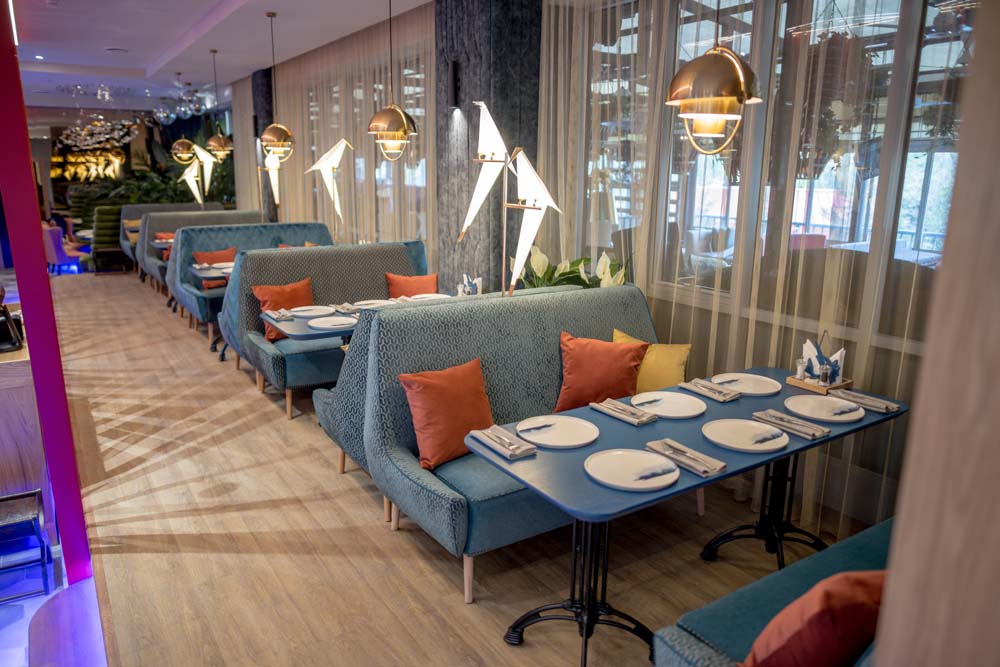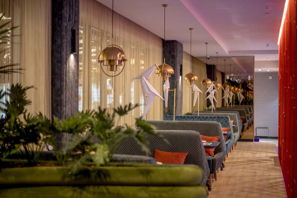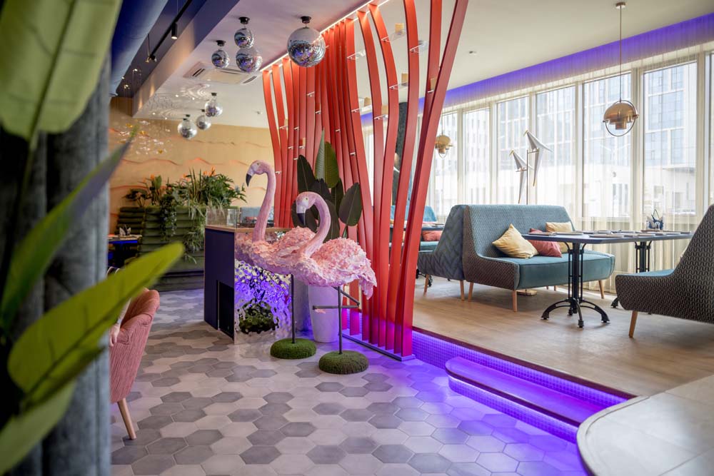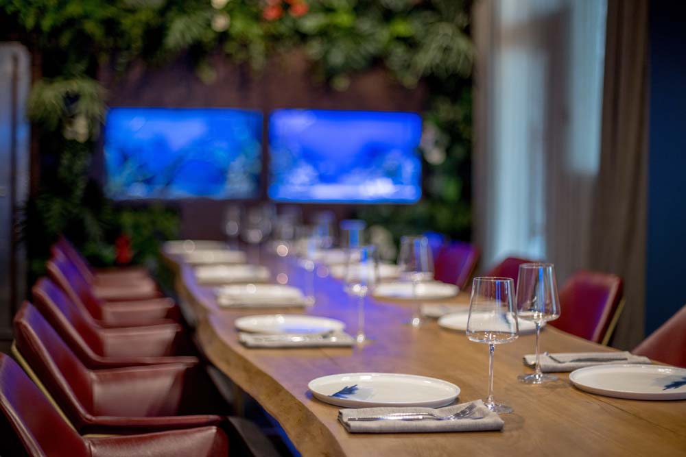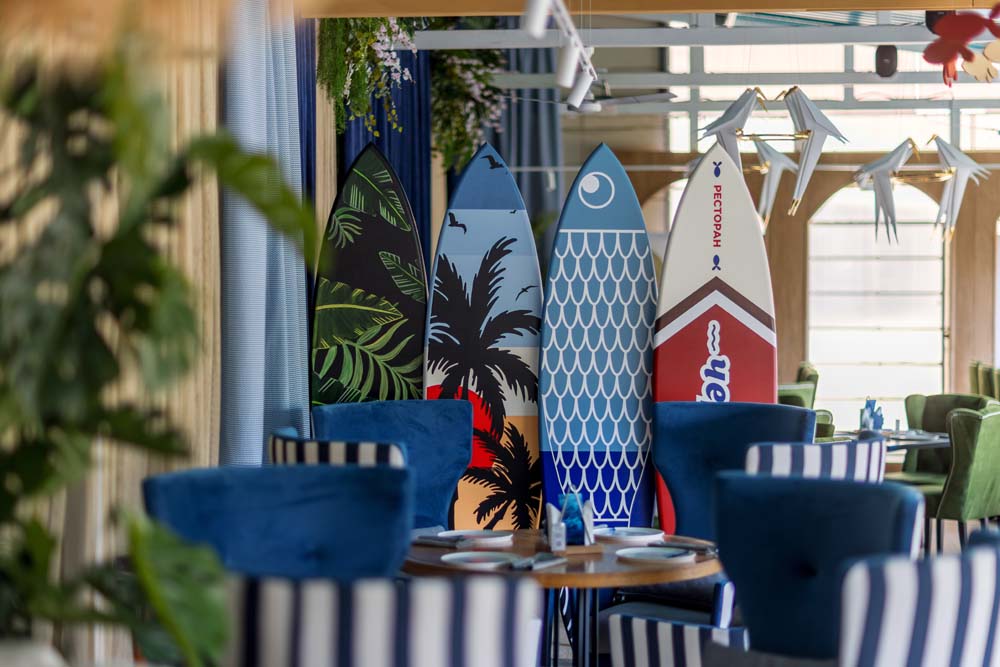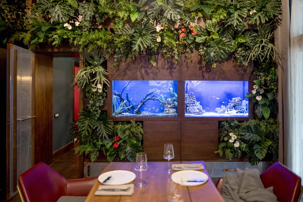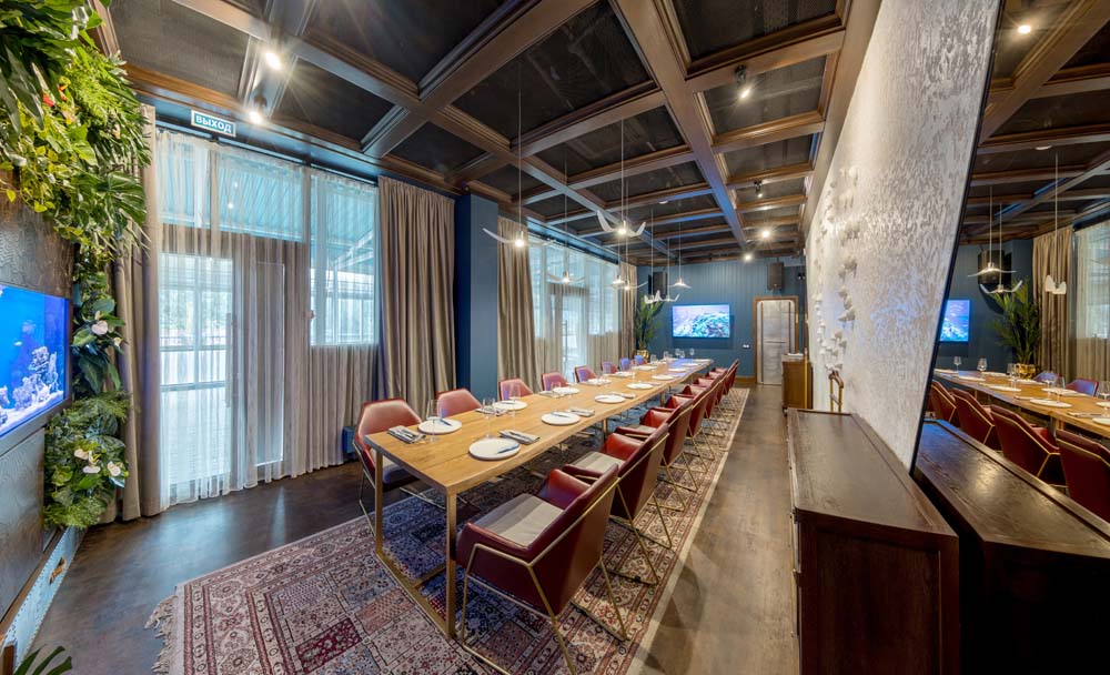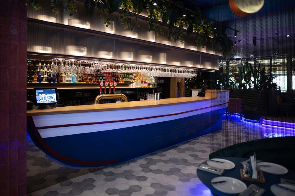 Могли бы вы представить, что вместо привычной барной стойки у нас посередине зала стоит огромная лодка? А рядом с ней трехметровый аквариум, где обитает разнообразная живность, готовая прекрасно украсить ваше блюдо?